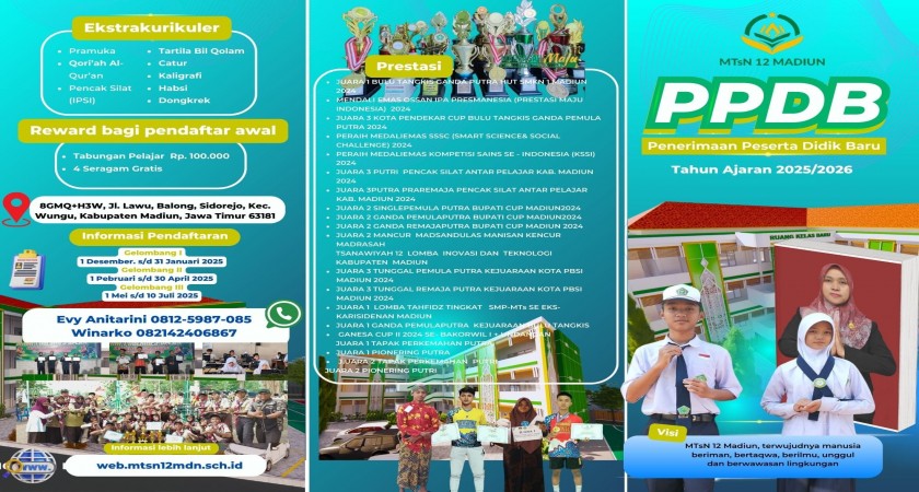 MTsN 12 MADIUN Tahun Pelajaran 2024/2025 Madiun, 31 Mei 2025 — MTsN 12 Madiun resmi mengumumkan kelulusan peserta didik kelas IX tahun pelajaran 2024/2025 pada hari Sabtu, 31 Mei