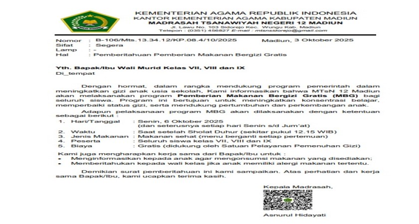 MTsN 12 MADIUN Tahun Pelajaran 2024/2025 Madiun, 31 Mei 2025 — MTsN 12 Madiun resmi mengumumkan kelulusan peserta didik kelas IX tahun pelajaran 2024/2025 pada hari Sabtu, 31 Mei